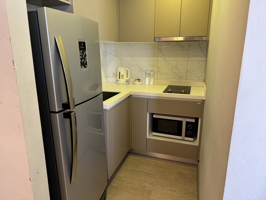 식탁 옆 쪽으로 부엌이 있고, 아파트먼트 답게 취사가능한 주방식기들은 다 구비되어있다.